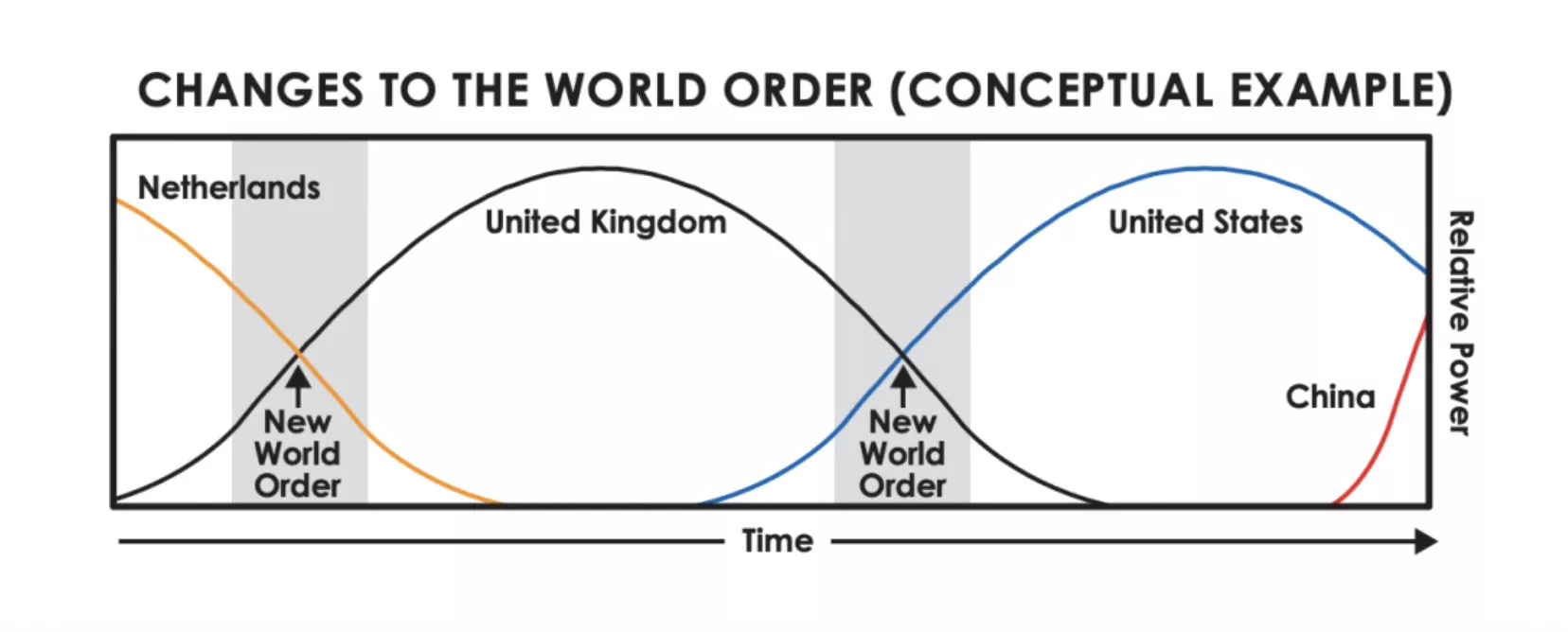 外部有序與混亂週期:各國之間的強弱關係,貿易、地緣政治、經濟或社會意識形態上的衝突是不是會影響到整體經濟的動向,藉由研究過去500年各強國興衰尋找一個脈絡,若想看清大局,絕不能一味聚焦在細節。